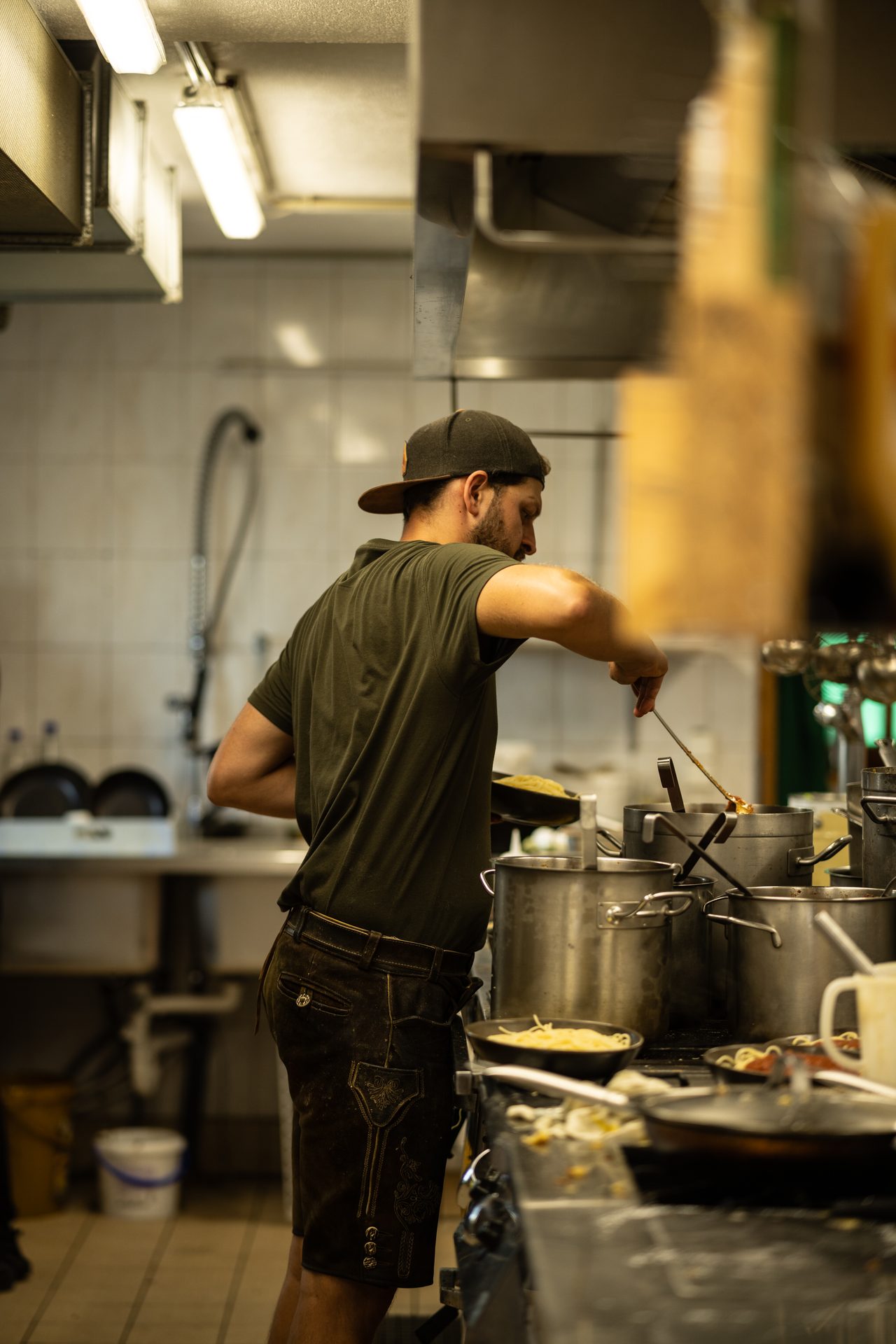 Auch morgen werden Hendrik, Michi, Louisa und die anderen vier Mitarbeiter bis spät abends arbeiten und früh aufstehen. Kaspressknödelbraten, Suppe kochen, Kaiserschmarren oder Tiroler Gröstl zubereiten, Getränke ausschenken und zwischendurch immer Fragen der Gäste beantworten. 60 bis 70 Bewerber hat Michi pro Saison. Am liebsten sind ihm Leute ohne Gastronomieerfahrung. „Sonst wird man hier oben narrisch“, sagt er. „Ein gelernter Koch macht mir nichts anderes als Küche. Ich brauche aber Leute, die gerne kochen und den Service machen, aber auch mal im Service anpacken oder die Zimmer machen.“ Im September wird sich auch Michi wieder für die nächste Saison bewerben. Es wäre nichts für ihn, direkt für zehn Jahre zu unterschreiben. Man wüsste ja nicht was kommt und wie man sich entwickeln wird. „Entscheidend ist, dass ich mit den meisten die hier oben arbeiten, als Freunde auseinandergehe. Eine gute Saison haben, gemeinsam lachen und den Gästen eine gute Zeit bieten. Dann schauen wir weiter.“