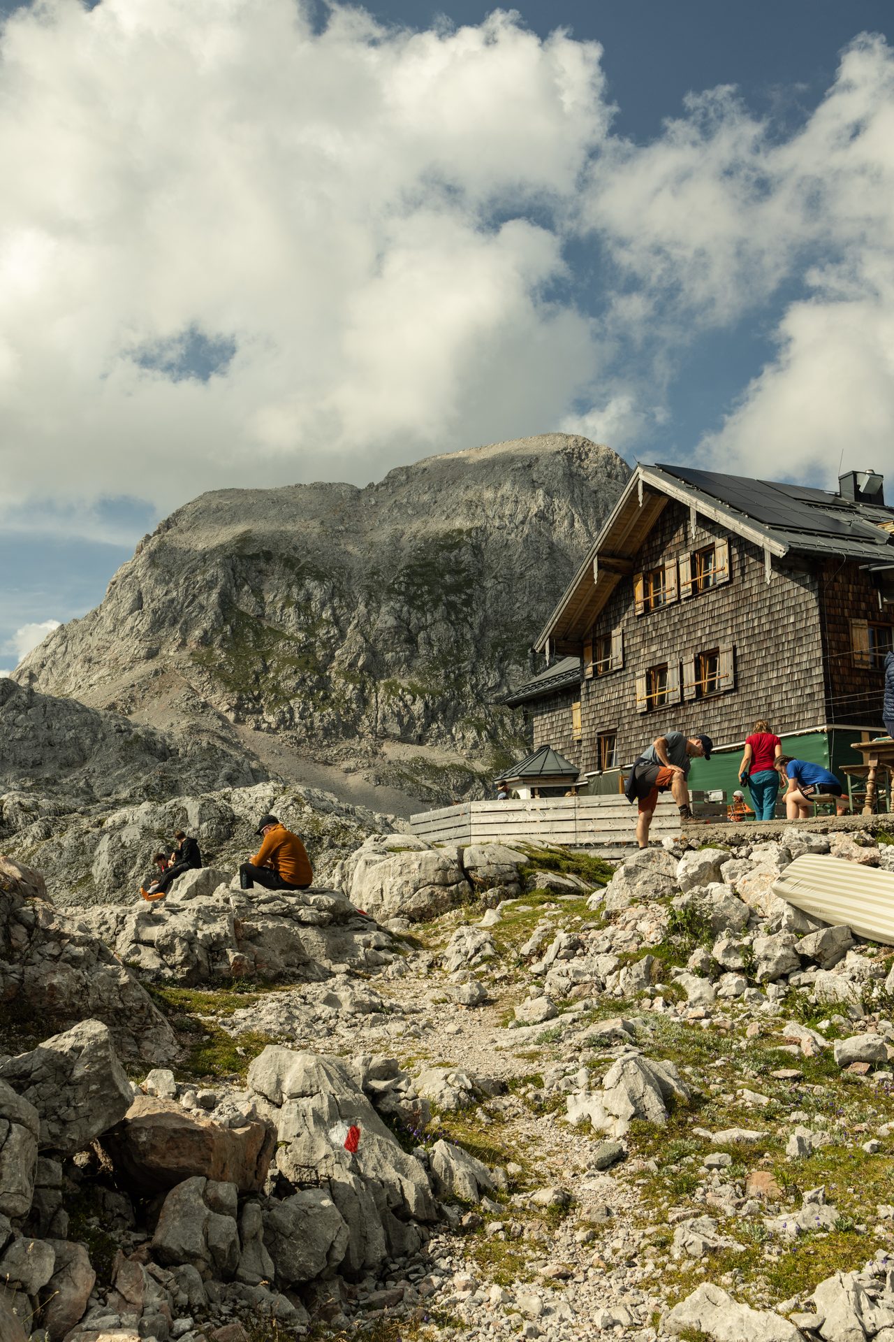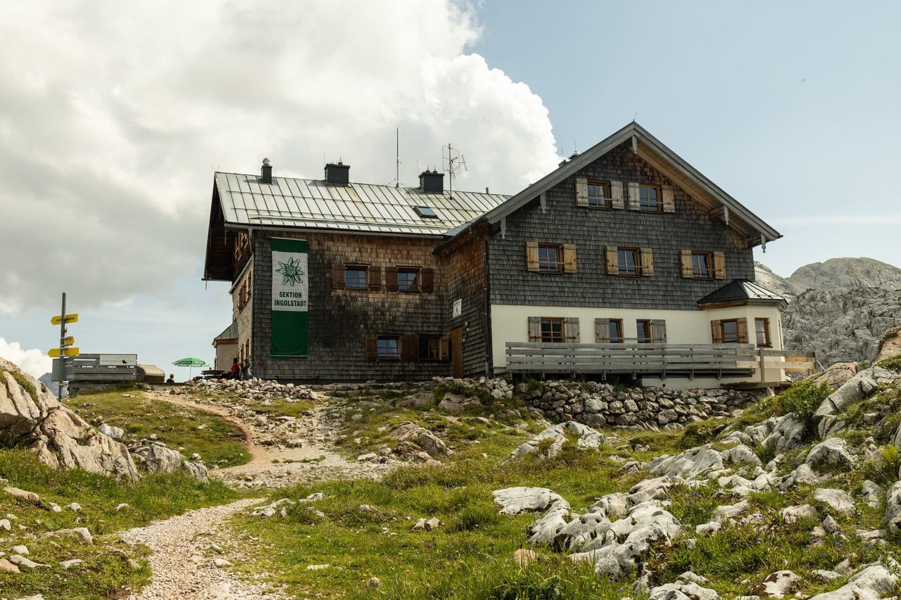 Es ist kurz nach 15 Uhr. Die Schutzhütte des DAV Ingolstadt steht in der hellen Nachmittagssonne da wie das Tor zum Steinernen Meer. Ein imposantes Gebäude aus massivem Stein und dunklem Holz, das trotz seiner Größe zwischen den Felsen ganz klein und urig wirkt. An den vielen Tischen vor dem Haus sitzen mehrere Gruppen zwischen drei und sechs Personen, die eifrig ihre Wanderkarten studieren. Die Köpfe zusammengesteckt fahren sie konzentriert mit den Fingern die rot gestrichelten Routen entlang.