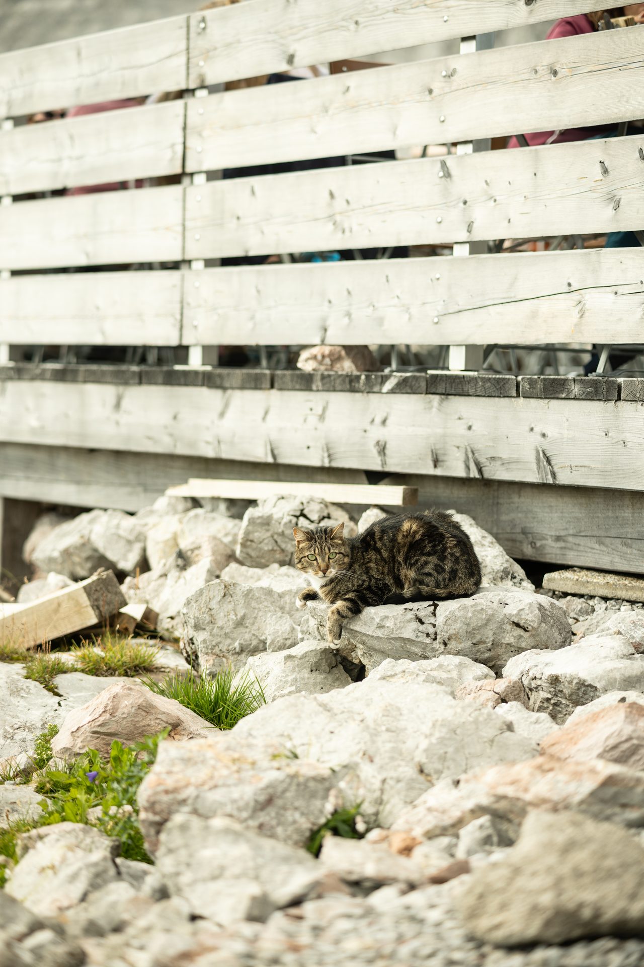 Während das Hüttenteam zwischen Küche, Tresen und Terrasse hin und her läuft, kauert vor dem Haus auf einem Stein ein braun getigerter Kater, der mit geschlossenen Augen ganz zufrieden seinen Kopf gen Sonne streckt. Er zeigt sich gar nicht beeindruckt von den vielen Menschen, die an ihm vorbeigehen. Manche bleiben stehen, wollen ihn streicheln. Aber so richtig Lust hat der darauf nicht, denn immer wenn einer die Hand ausstreckt, dreht er seinen Kopf ganz elegant in die entgegengesetzte Richtung. Pauli, der Kater von Wirt Michael Millinger, verbringt den Sommer schon das vierte Jahr hier oben. Und mittlerweile ist auch er angekommen. Michi trägt Lederhose, kariertes Hemd und Sportschuhe – seine Alltagskleidung hier oben. Viel Verschnaufpause hat er nicht, denn die Gäste wollen sich anmelden, Fragen stellen und warten ungeduldig in der Hütte. Immer wieder bleiben manche beim Anstehen im schmalen Gang mit ihren schweren Rucksäcken aneinander hängen.